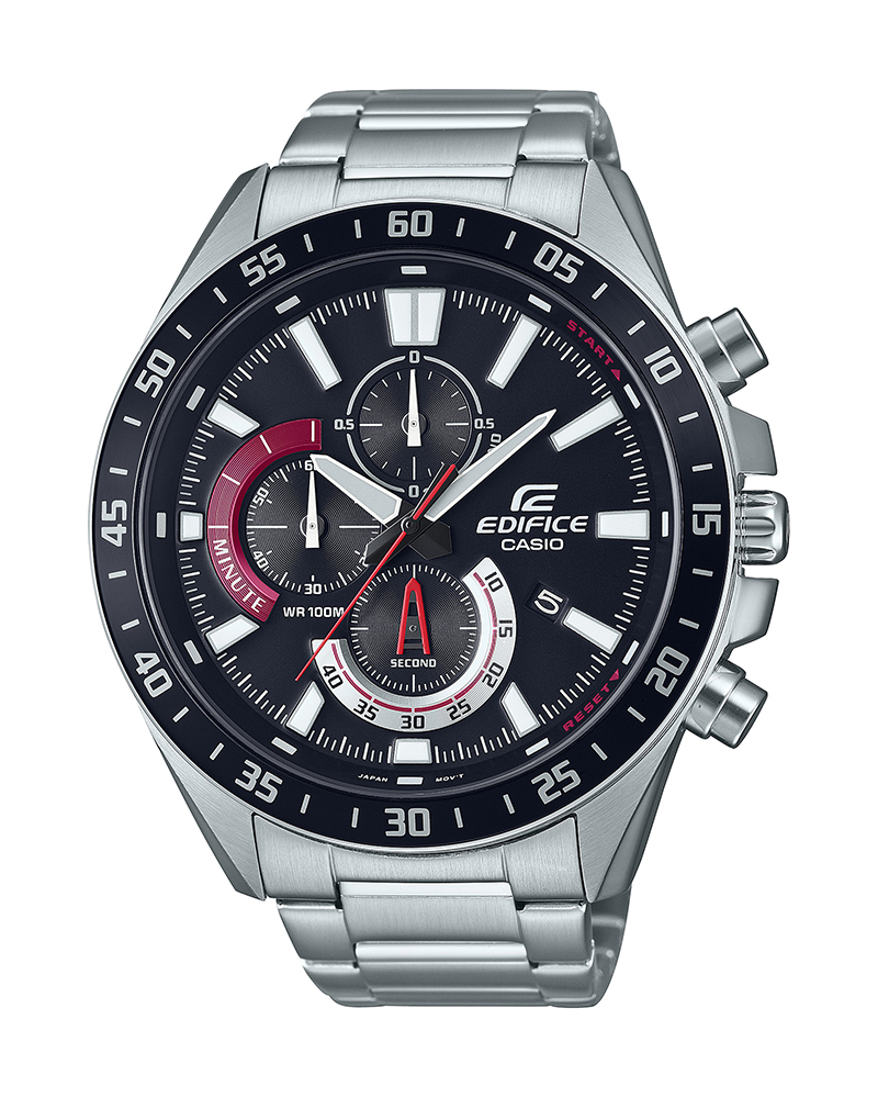 Experience precision and style with the Casio Edifice Men's Quartz Chronograph Watch. Featuring a sleek black dial encased in a robust 55mm stainless steel case, this watch combines functionality with elegance. The chronograph, date display, and stopwatch functions cater to your practical needs, while the stainless steel bracelet adds a touch of sophistication. With its quartz movement ensuring accurate timekeeping and a water resistance of up to 100 meters, this watch is ideal for both everyday wear and special occasions.