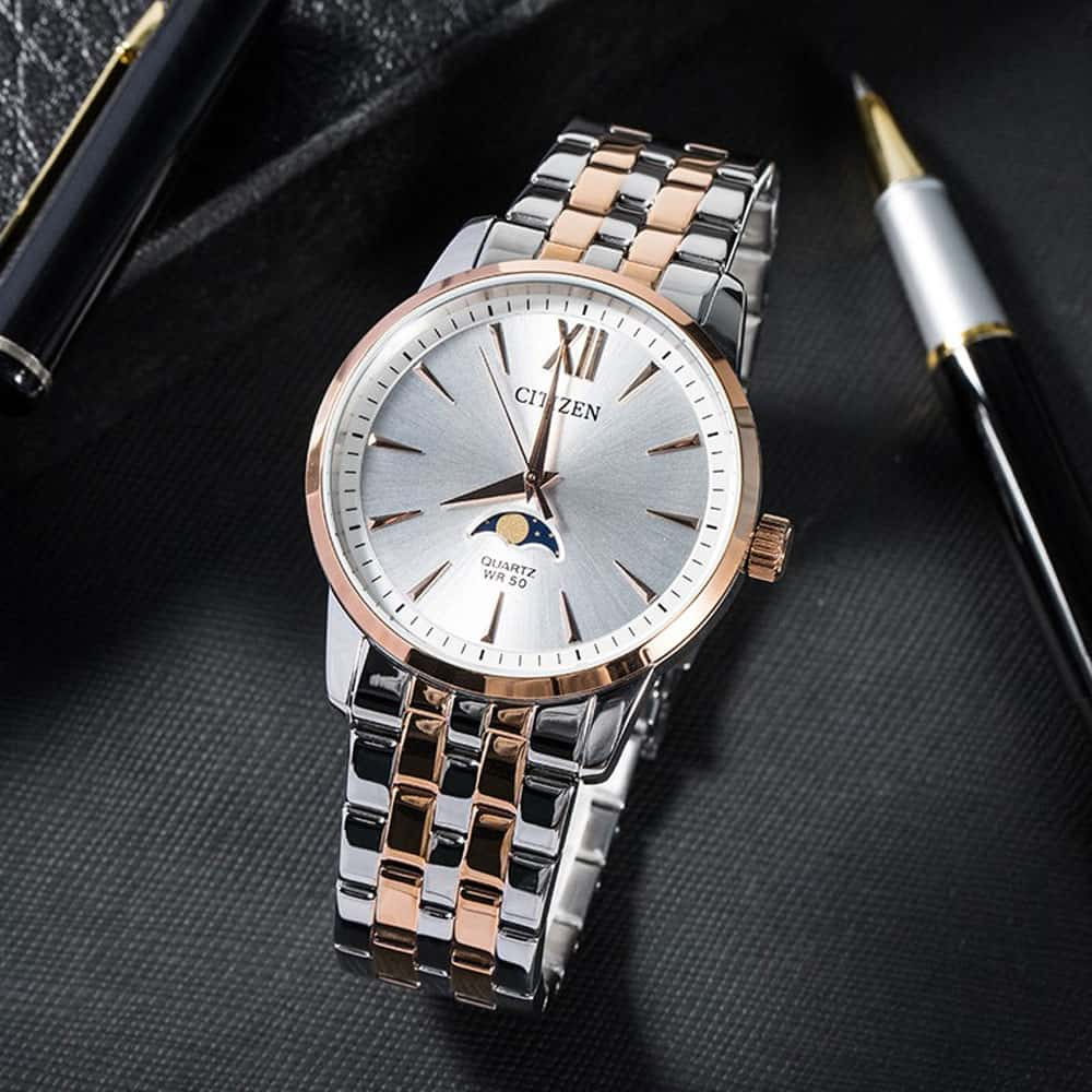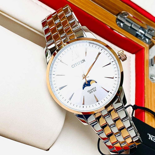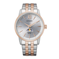 The Citizen AK5006-58A is a sophisticated men’s quartz watch that combines timeless elegance with modern functionality. Featuring a refined silver round dial with a moon phase display, a polished silver stainless steel case, and a stylish two-tone silver and rose gold bracelet, this watch is the perfect accessory for men who want both style and precision.