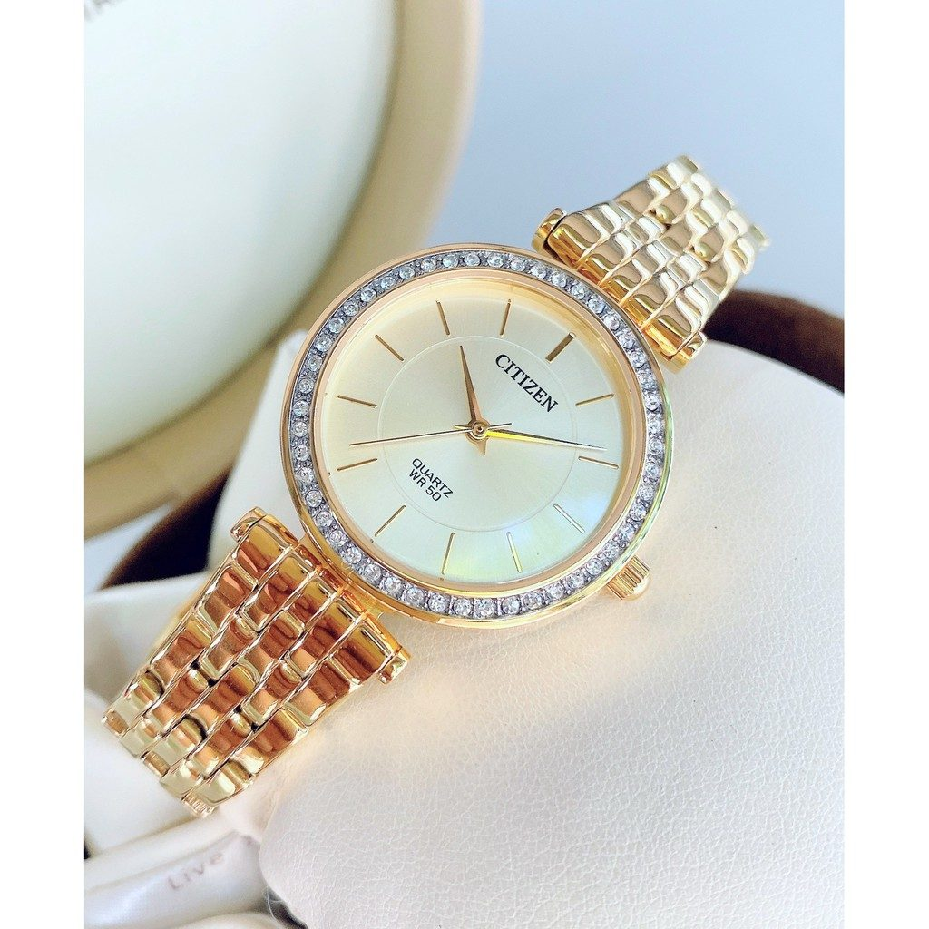 Elegant and Stylish Design: The Citizen ER0212-50Y features a sleek round case with a polished gold-tone finish, complemented by a matching stainless steel strap with gold-tone plating. The sophisticated design makes it perfect for both formal and casual wear.