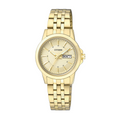 Elegant and Stylish Design: The Citizen EQ0603-59P features a sleek 27.5 mm round case with a polished gold-tone finish, complemented by a matching stainless steel strap with gold plating. The sophisticated design makes it perfect for both formal and casual wear.